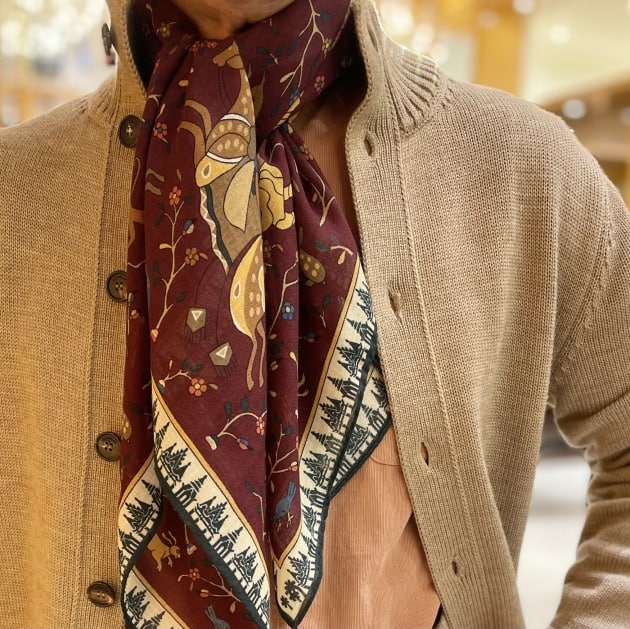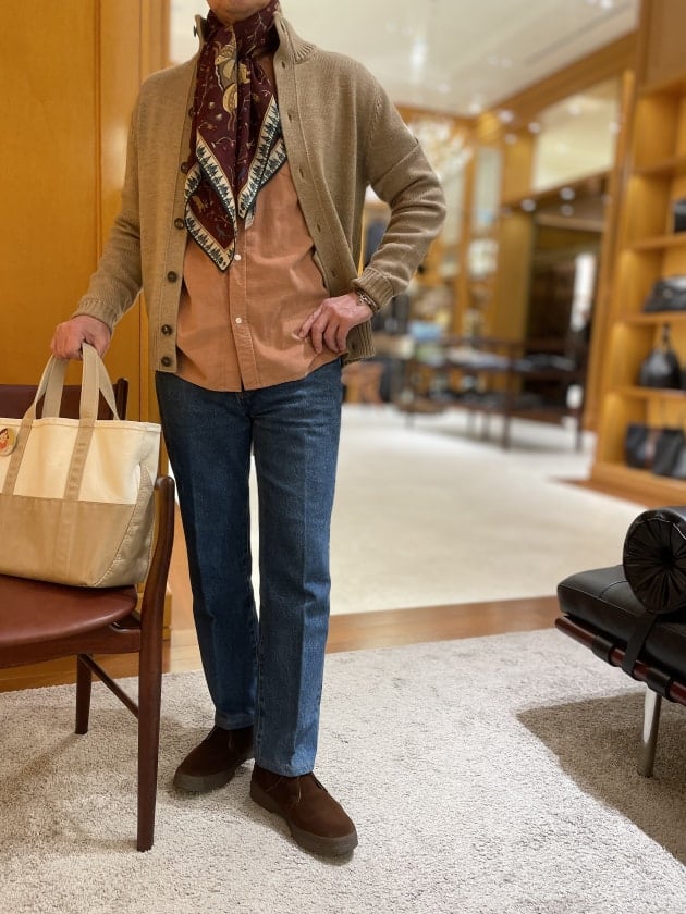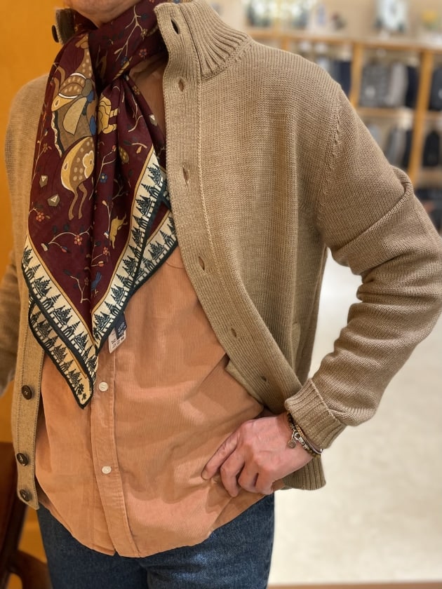 定番の〈ZANONE(ザノーネ)〉CHIOTOのカジュアルスタイリング。インナーには昨シーズン当店で人気だった〈Placide(プラシーデ)〉のバンドカラーコーデュロイシャツ。そこに〈Drake's(ドレイクス)〉のストールで表情を。