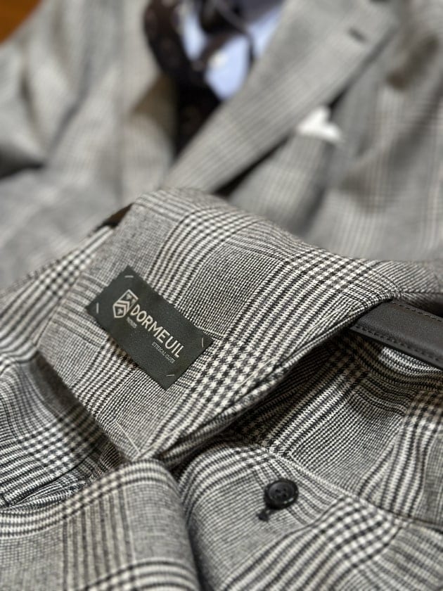 ドーメル社のグランプレイド生地。格子の入り方がクラシックなグランチェックよりも、やや大ぶりで一部濃度に変化をつけた、非常に洒落たラグジュアリーな生地です。