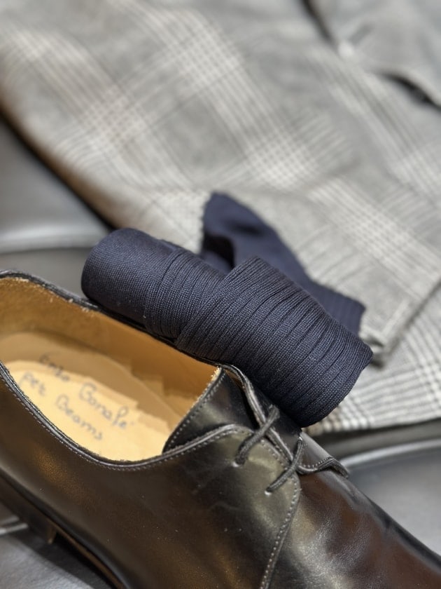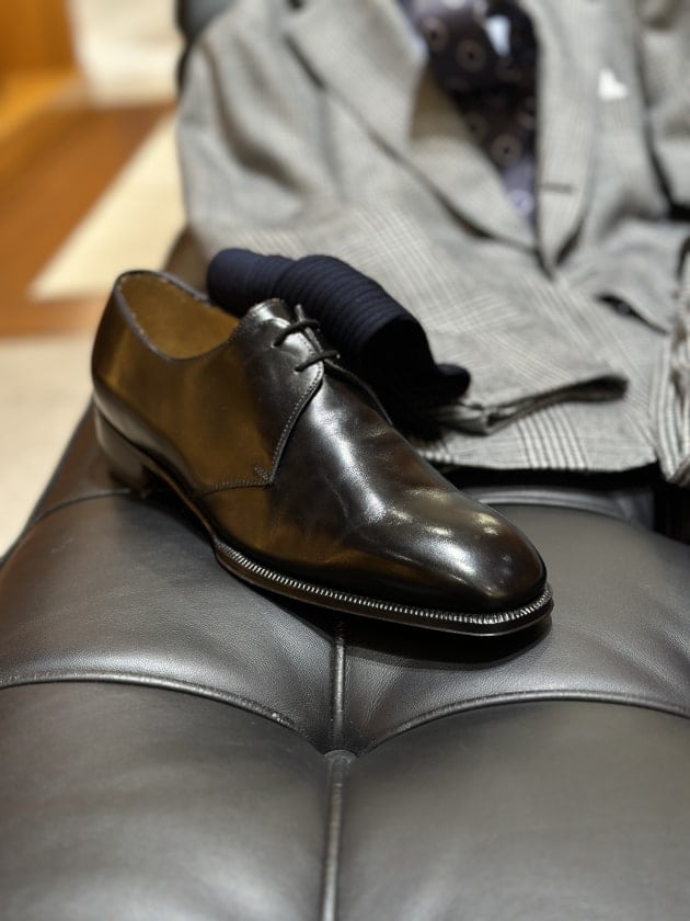外羽根の紐靴ときくと、どうしても無骨でスポーティな印象が強いですが2アイレットという仕様ともなれば話は変わってエレガントな印象!ドレス界隈に旋風を巻き起こした彼のように!