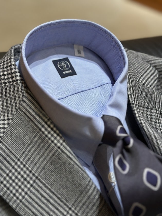 サックスブルーというよりも、ややライトネイビーのような青みがしっかりあるブルータブカラーシャツを。