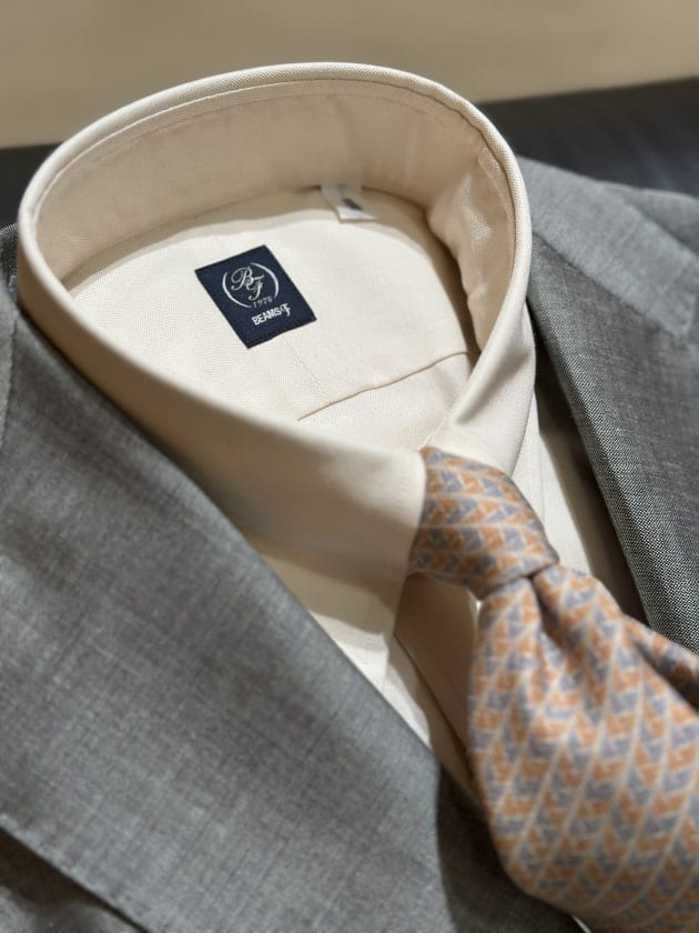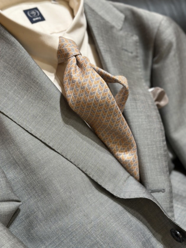 淡いオレンジのネクタイと色馴染みが綺麗なクリーム色のシャツ。タブカラーでノットを小さくコンパクトに!というのも重要なポイント!