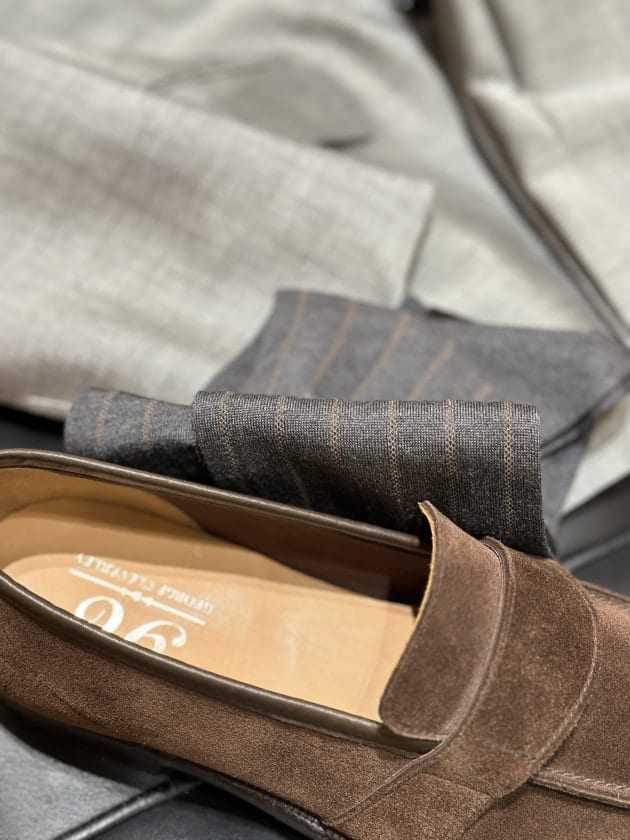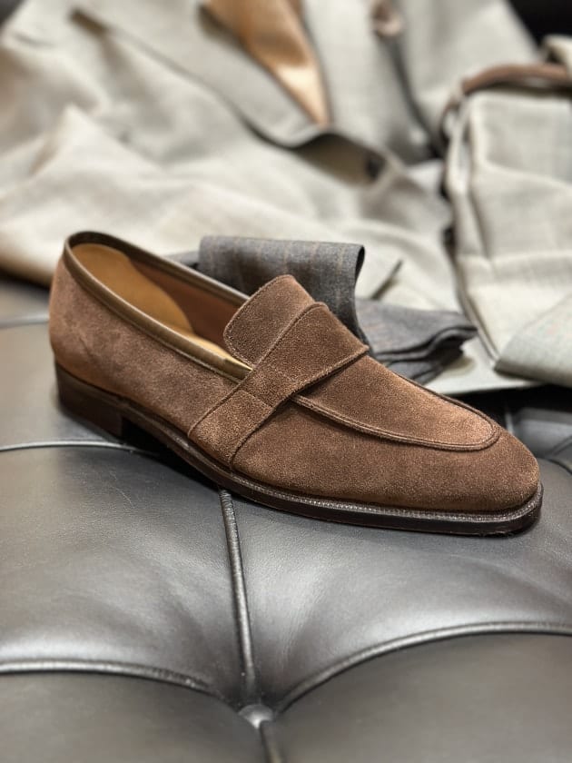 足元は軽やかさとエレガントさを程よく表現できるブラウンスウェードのドレススリッポンを。