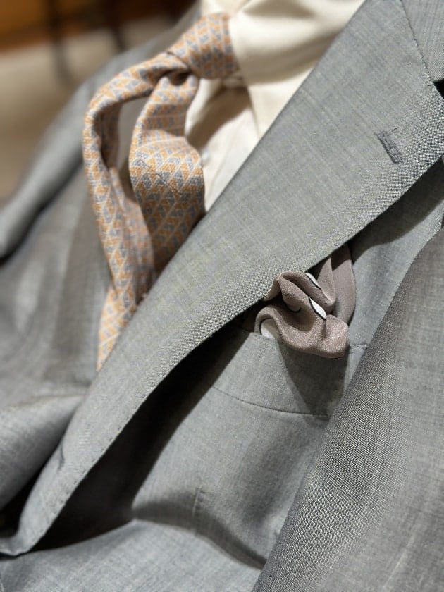 全体の色を拾いすぎない、グレージュのチーフを。柔らかなシルク生地というのも大事なポイント。