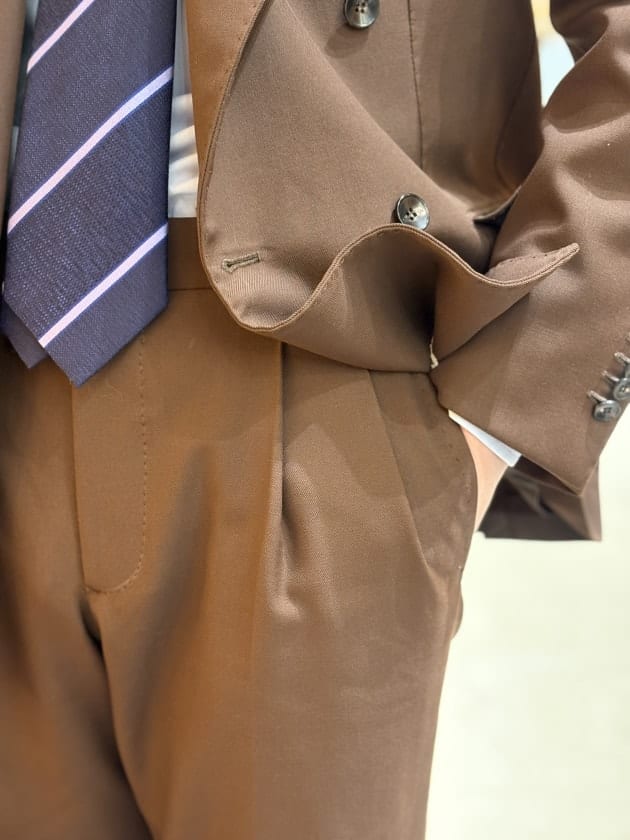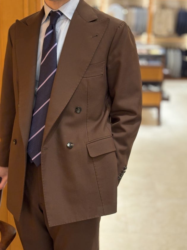 今シーズンお求めのブラウンの4つボタンダブルスーツ。その素材のウールギャバジンは、ウェイトもあり真夏よりは春秋のほうが着やすいスーツ。