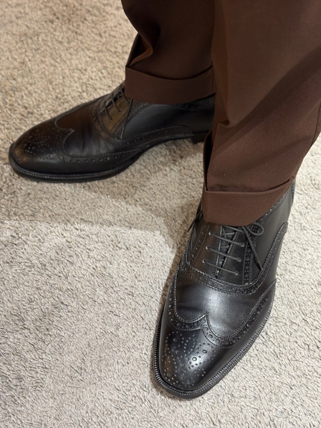 足元は以前に展開があった〈Enzo Bonafe(エンツォ ボナフェ)〉のブラックカーフのフルブローグ。