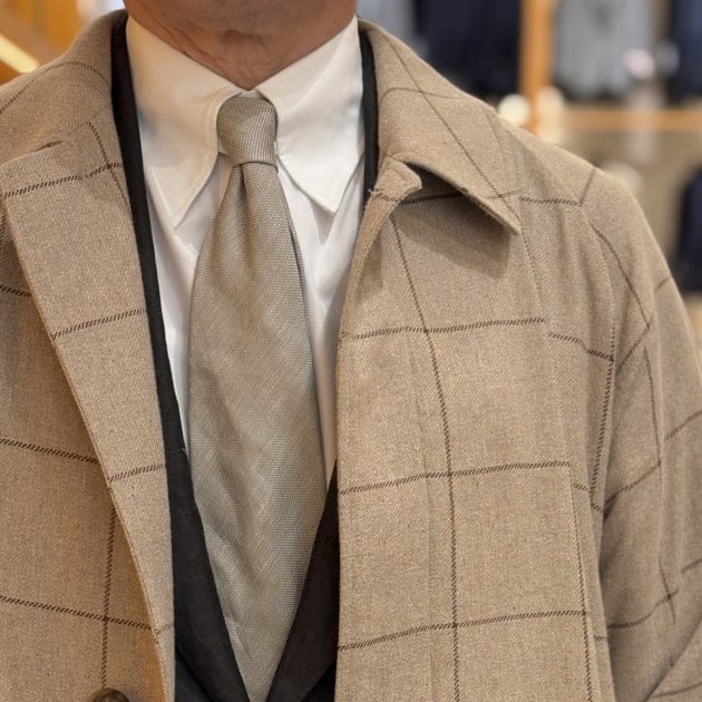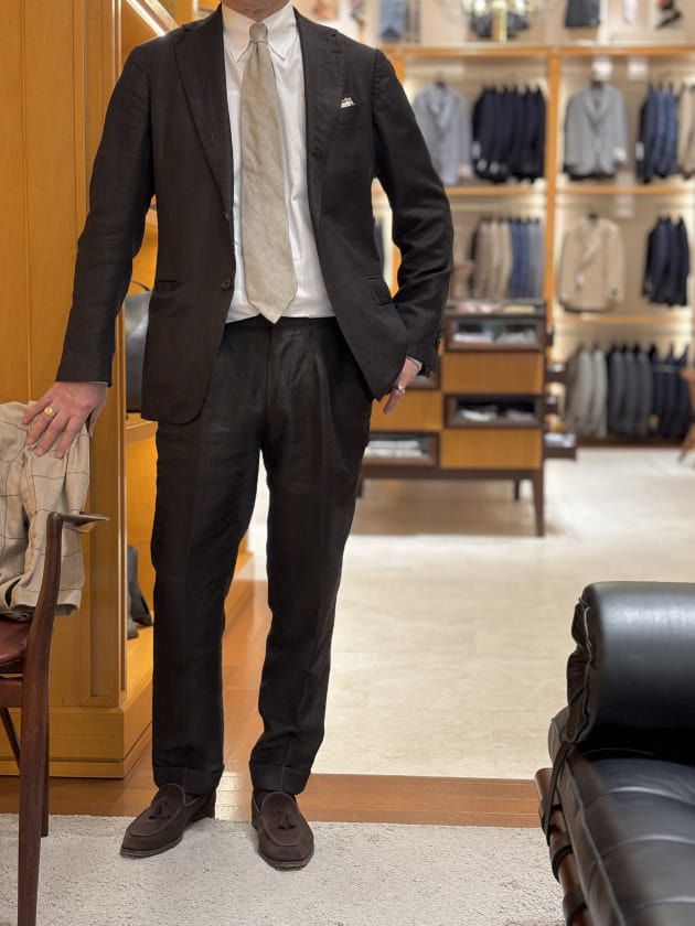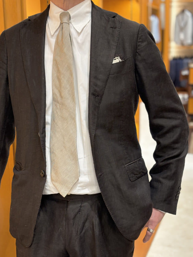 ダークブラウンのウールリネンスーツは以前にお求めのBrilla per il gusto。ホワイトのタブカラーシャツは〈BARBA(バルバ)〉。そこにBEAMS Fのグレージュのリネンタイ。