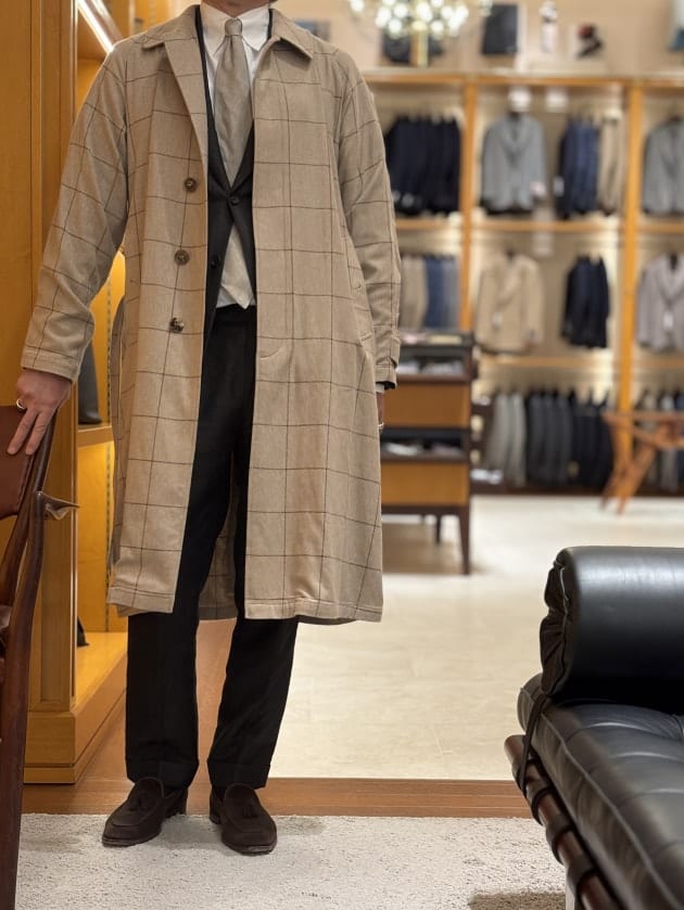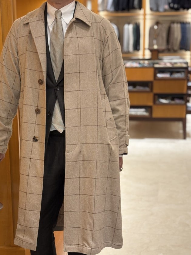 かなり以前に展開があった〈INVERTERE(インバーティア)〉のベージュウィンドウペーンのベルテッドバルカラーコート。