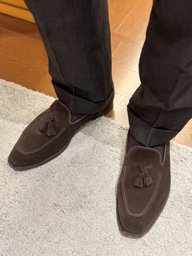 足元は以前に展開があった〈CROCKETT&JONES(クロケットアンドジョーンズ)〉のダークブラウンスエード アンライニングローファー。