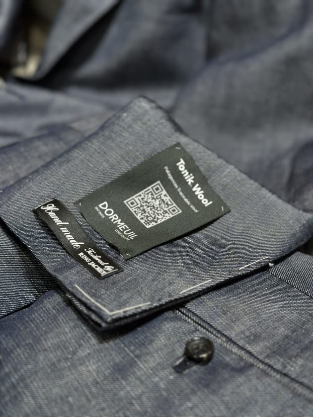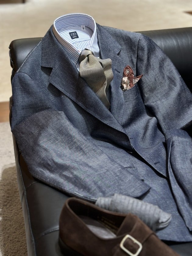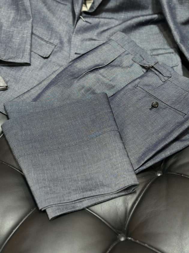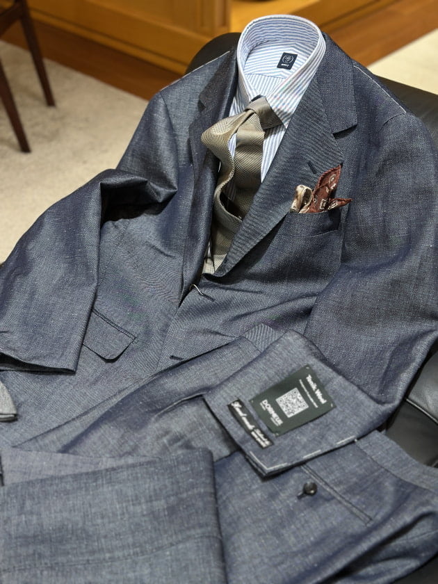 デニム同様にインディゴ着色を加え、デニム織で表現!デニムスーツですが、ラグジュアリーな雰囲気を高めた最高級なデニムスーツといっても過言ではないでしょう。