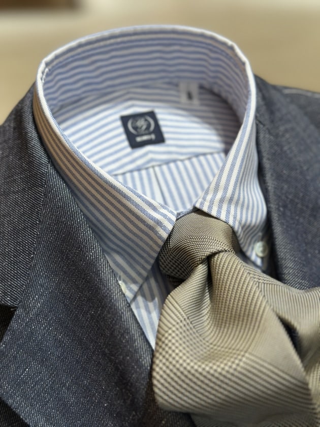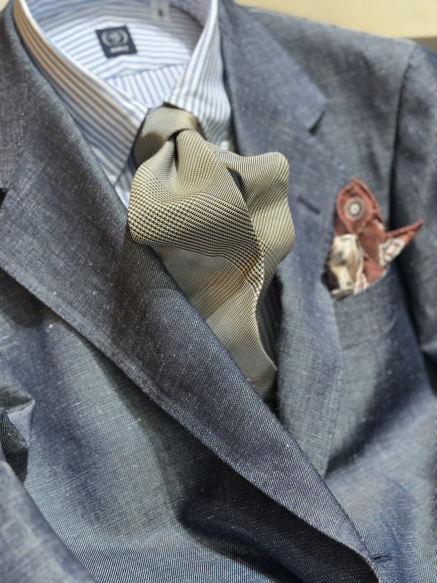 グレンプレイドというとフォーマル、ドレッシーに感じますが、こちらはブラウンで構成されたややスポーティでレトロ感のあるネクタイ。絶妙な生地のスーツなので、トラディショナルな雰囲気も醸し出しながら!