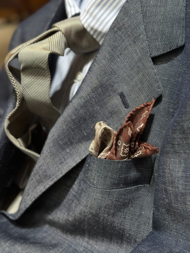 レトロな雰囲気のネクタイに、レトロ感のあるプリントチーフを!