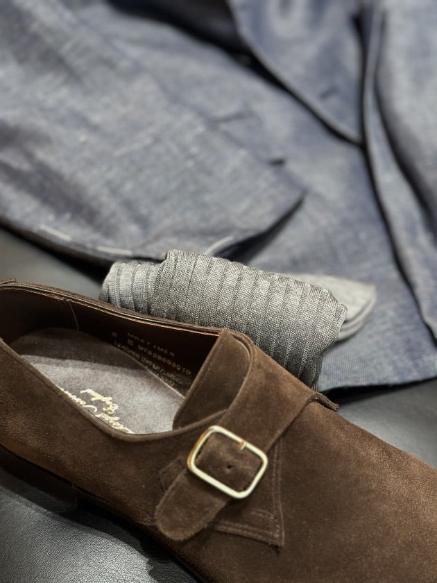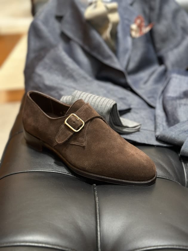 レースアップとローファーとの中間ぐらいのシングルモンクのブラウンスウェードで。
