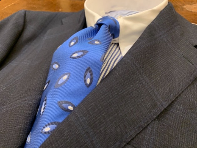 ロンドンストライプのタブカラークレリックシャツに小紋タイ。