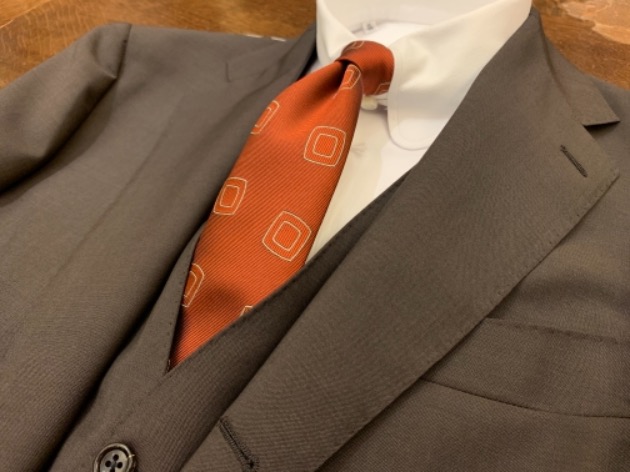 ブラウンと非常に相性の良い色のオレンジの小紋タイを合わせた品格漂うシックなコーディネートがオススメ!