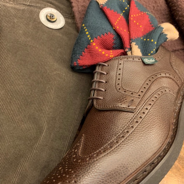 コーデュロイパンツにウィングチップのシボ革ラバーソールシューズにアーガイルソックス。