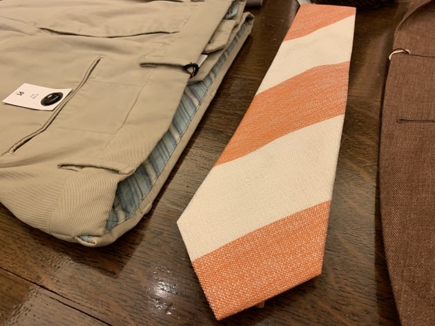ホワイトとオレンジの配色が春夏だからこそ映えるネクタイ。胸元がグッと明るく見え茶色のジャケットもクリーンな印象に!
