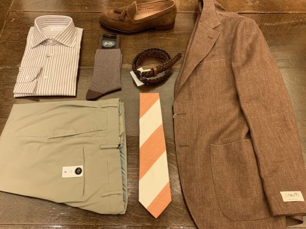ですが、ブラウンでも少し明るめをお選びになってネクタイなどで白などのクリーンなお色を選べば清涼感あるスタイリングになります!