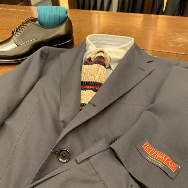 色の統一感は保ちながらのカラーソックス選びをしました。ネイビーコットンスーツにブラックシューズというところから見ても、ブルー・ネイビー系統のカラーソックスが合うのではと感じます。