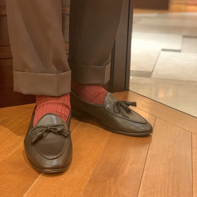 個人的には<Baudoin & Lange>のような華奢な靴、<Paraboot>のようなボリュームのある靴にはカラーソックスがマッチすると感じています。宮原もおそらく同じ考えです。