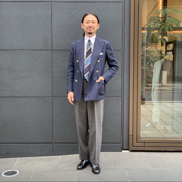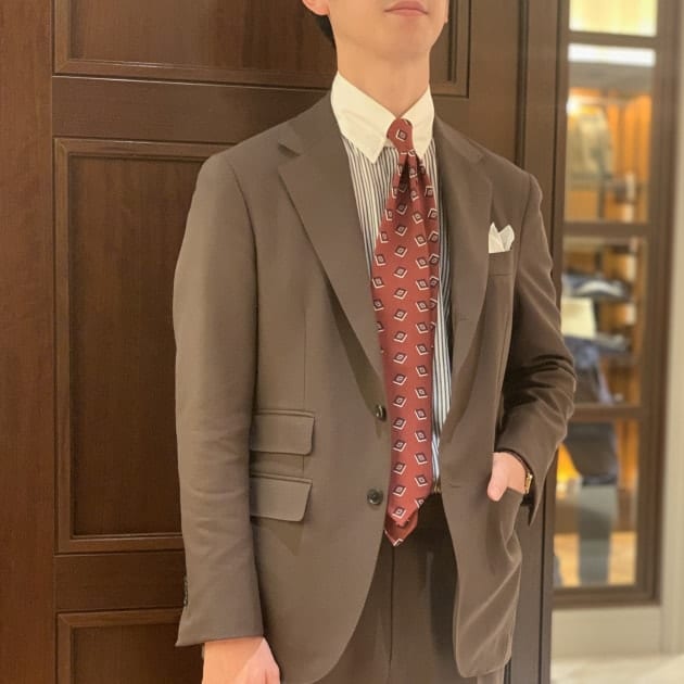 ネクタイに目がいきつつもパンツとシューズの繋ぎ色として選びました。