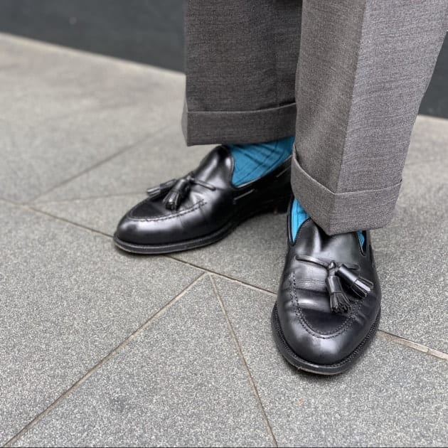 足元だけみると、チグハグだな〜と感じてしまうかもしれません。勿論パンツとシューズを繋ぐアイテムとしてソックスは色を選ばなければなりません。