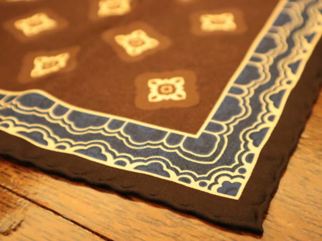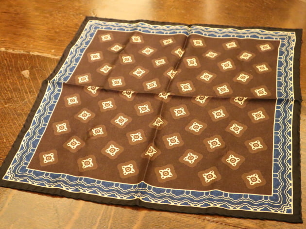 ブラウンベースにブラックとネイビーのシルクプリントチーフ。