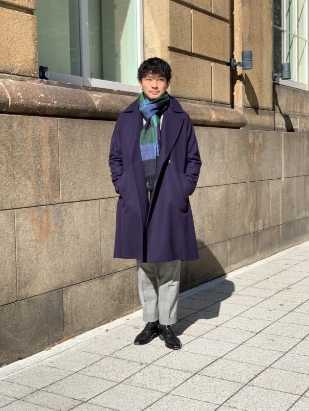 大判のマフラーだからこそ、首にグルッと後ろ側に巻いてマフラーのボリューム感を活かした巻き方です! さすがです。アニキ!!