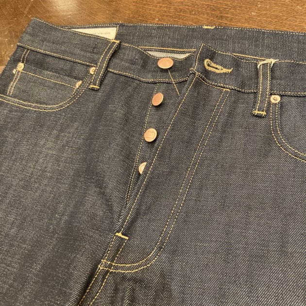 こちらもボタンフライ。14ozデニムのこちらは通常のデニムよりも滑らかで、 パリッとした肌触りが特徴の上品で美しい質感です。