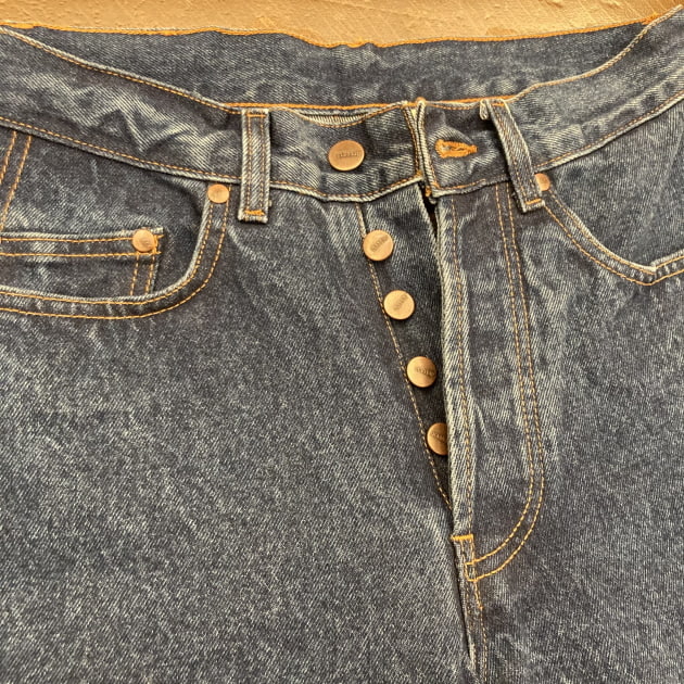こちらもボタンフライ。14ozデニムのこちらは通常のデニムよりも滑らかで、 パリッとした肌触りが特徴の上品で美しい質感です。