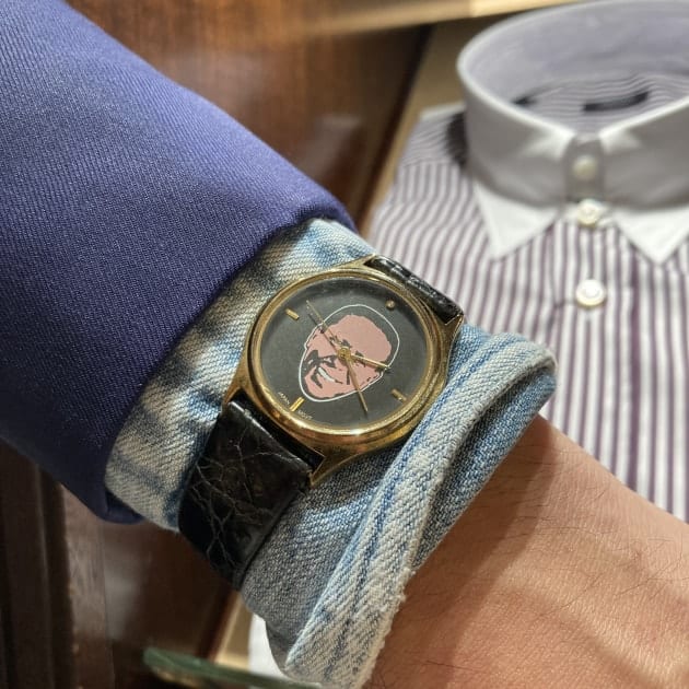 約10年前に、海外のオークションサイトで入手したあるアーティストが描かれた時計。その昔、これを身につけた方の影響もありBEAMS内でも、コアなスタッフに人気です。クオーツで型押しカーフのストラップのこちらは、サラッとしたスタイリング時に身に着けることが多いそうです。