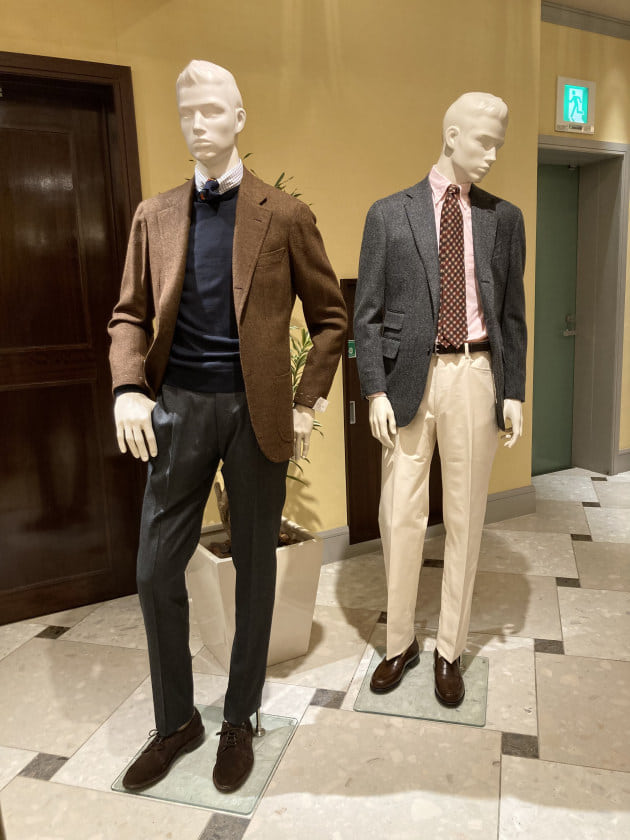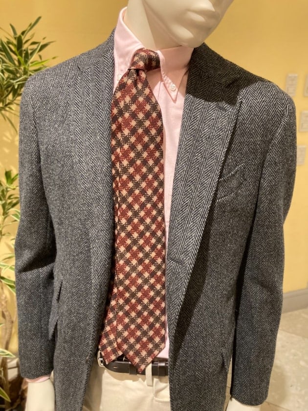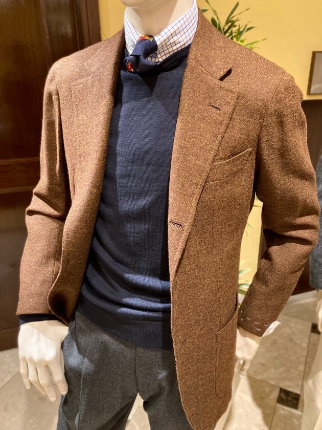 こちらもまた不動の人気を誇る最高級の着心地、そこにあえて少しツイーディな生地を使用しているというところがまた良いですね。グレーのヘリンボーンにチェンジポケット付きのブリティッシュなジャケット。