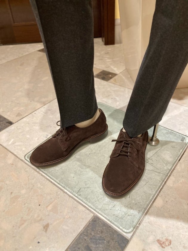 ブリティッシュアメリカンな全体をまとめる足元は、外羽根スエードプレートゥ。このぐらいドレスダウンしてもリラックス感があり良いですよね。