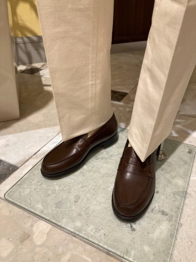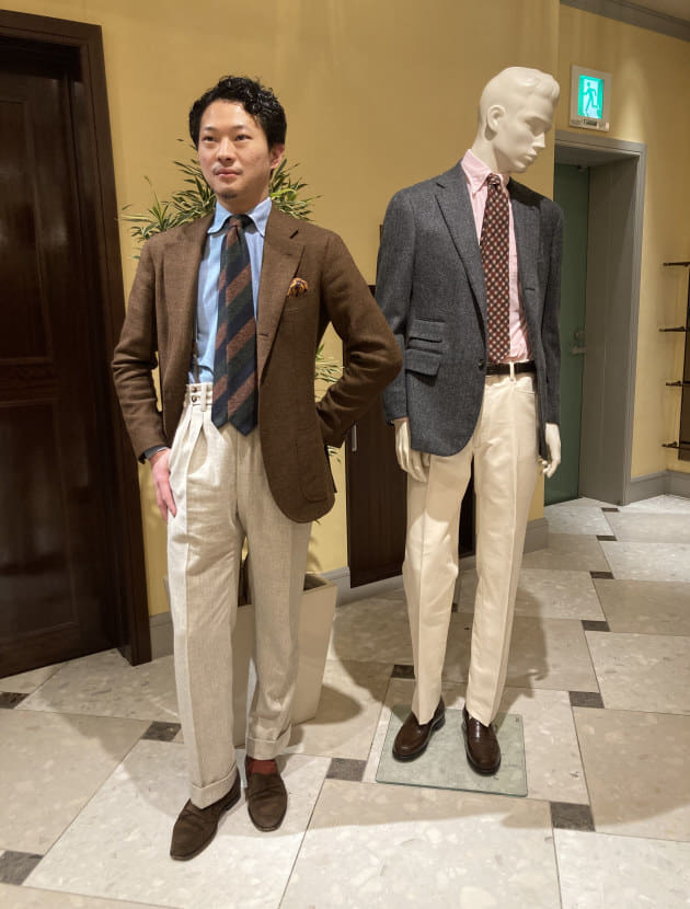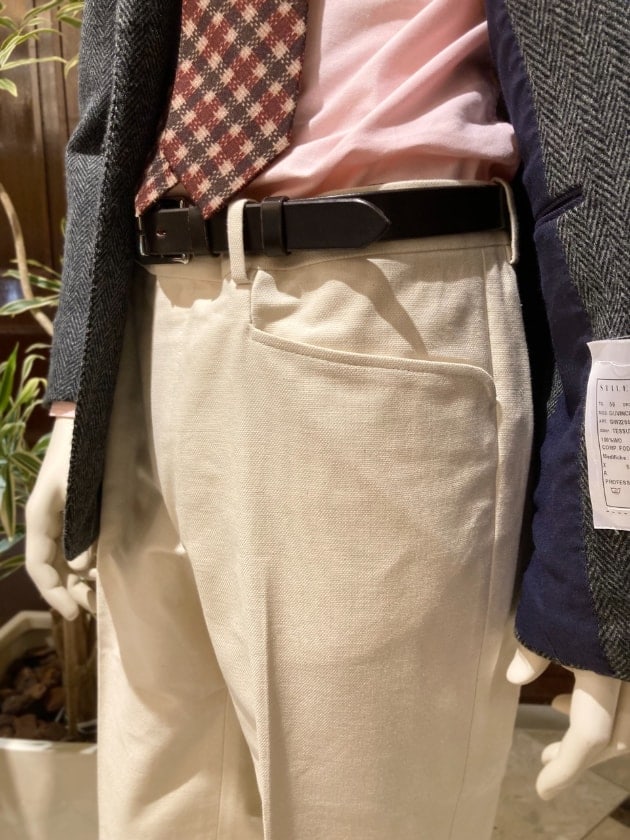 パンツはフランスブランドのLポケット。既製品では中々ないので、この形を見ればすぐ分かりますね。生地のウェイトや色が絶妙です。