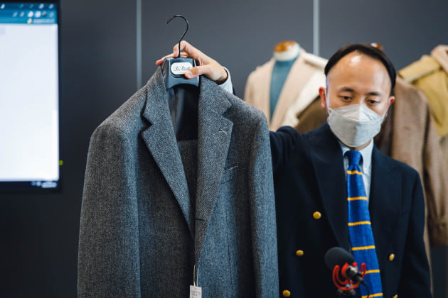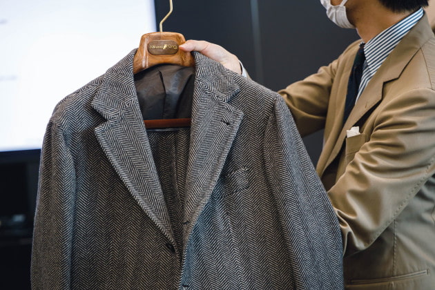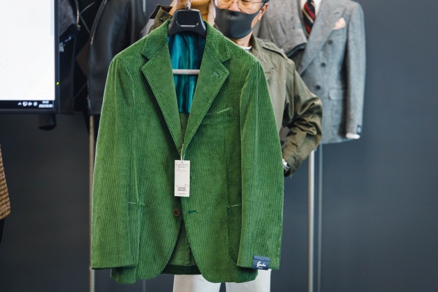 「一方で、趣味性の高いスーツといったカテゴリーは盛り上がっています。ヘリンボーンやコーデュロイ、ツイーディな生地のものなど、洒落感のあるものが見られました。スーツが好きな方の為の提案です。」