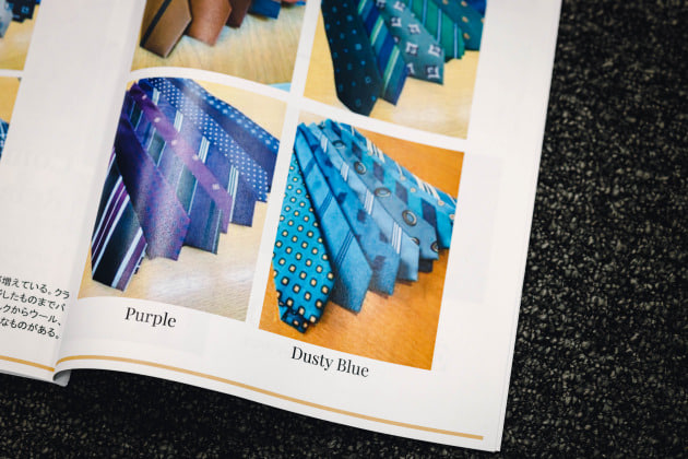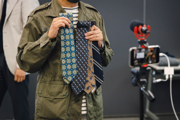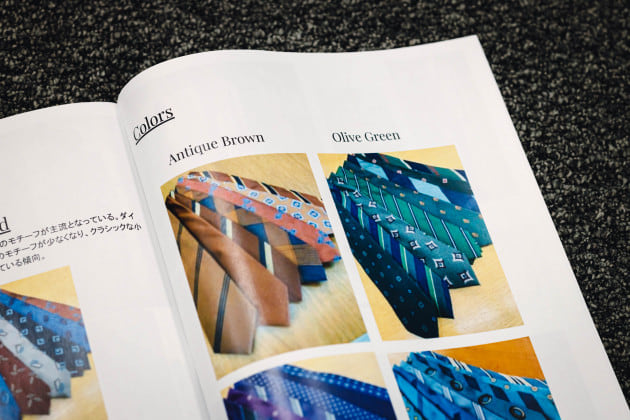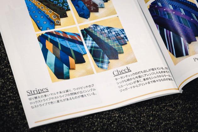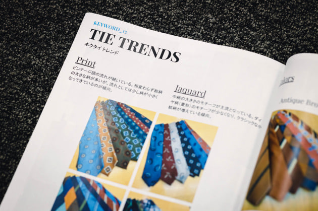 「ネクタイに関しては特に大きな流れはなく、継続してヴィンテージ調のものが多く見られました。ただ、その中でも微妙に変化があります。プリントに関しては柄がやや小さくなってきており、ジャカードは今まで多かったダイヤ柄が減ってラウンドした、よりクラシカルな表情のものが提案されています。」