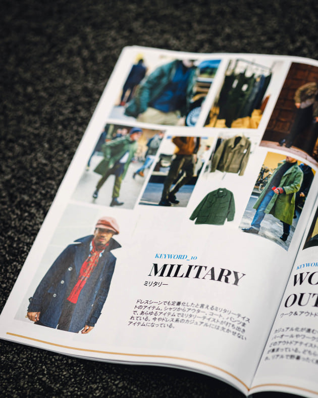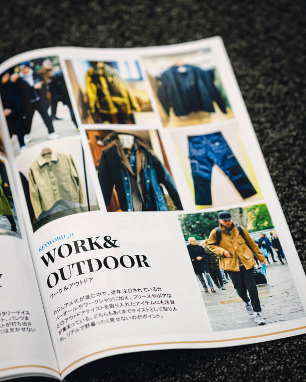 「ミリタリーと対になって出てくることの多いワークやアウトドアのアイテム。先ほど出てきたフリースやカバーオールなども大きくはこのカテゴリーに含まれます。ただ、あくまでドレスとしての提案ですので、リアルな着こなしではなく品を残したスタイルでの提案です。そこがカジュアルとの違いですね。」
