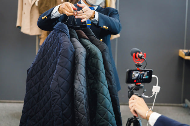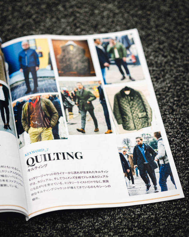 「これもフリース、ボア同様、ウィメンズやカジュアルでは既に出てきていたもの。カジュアルではミリタリー系が中心ですが、ドレスではそれもありつつリバイバル的な流れとして、英国的なキルティングアウターが注目されています。人気の高い〈Barbour〉の並びとしての側面もあると思います。オーセンティックなキルティングの着こなしが提案されていました。」