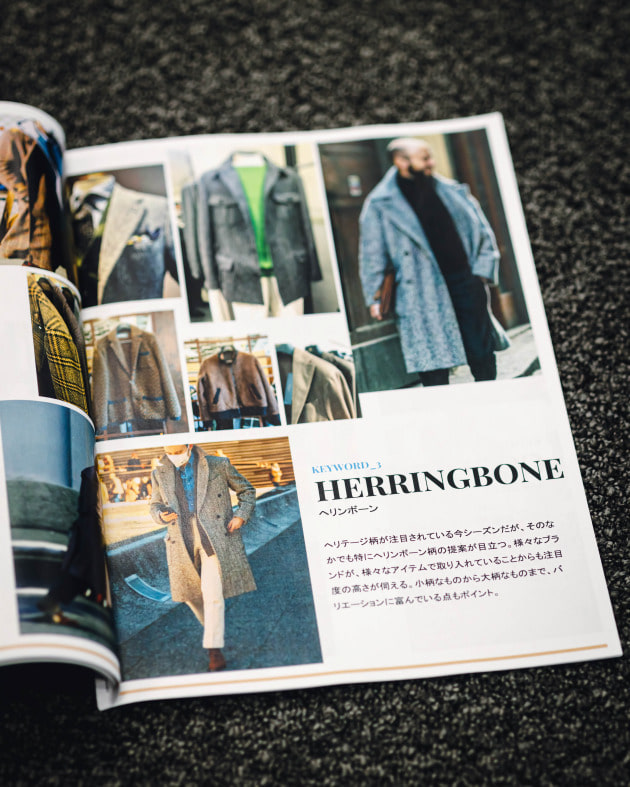 「ヘリンボーンもヘリテージというキーワードでは欠かせないパターン。次のシーズンでは大柄でややハッキリとしたものが多く提案されていました。ジャケットやスーツなどの重衣料だけでなく、ニットやシャツにまで広がりを見せており、コーディネートの様々な部分で取り入れられています。所謂ツイードのようなものだけでなく、無地ライクな織り柄で表現されているものもありますね。」
