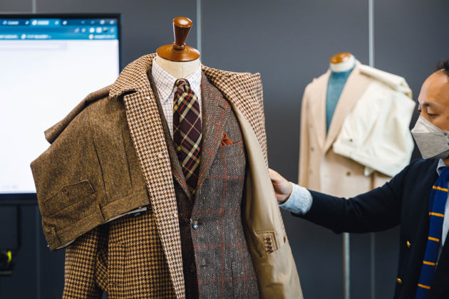 「チェックに関しては本当に多く、絞りきれないので今回はヘリテージチェックというカテゴリーでご説明します。これまでも注目されていたグレンプレイドやガンクラブチェックなどの英国の伝統的パターンは引き続き提案されていますが、新たにタッタソールなどの柄も非常に注目されています。」