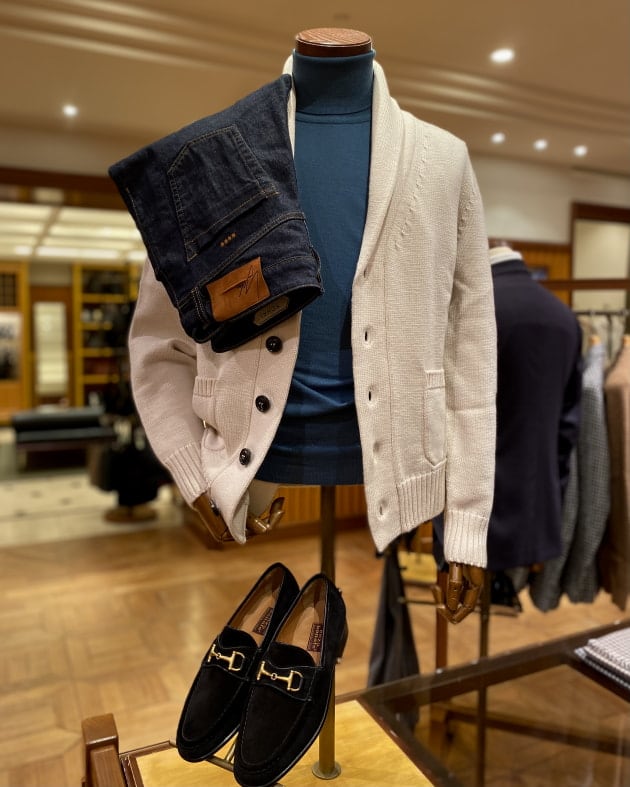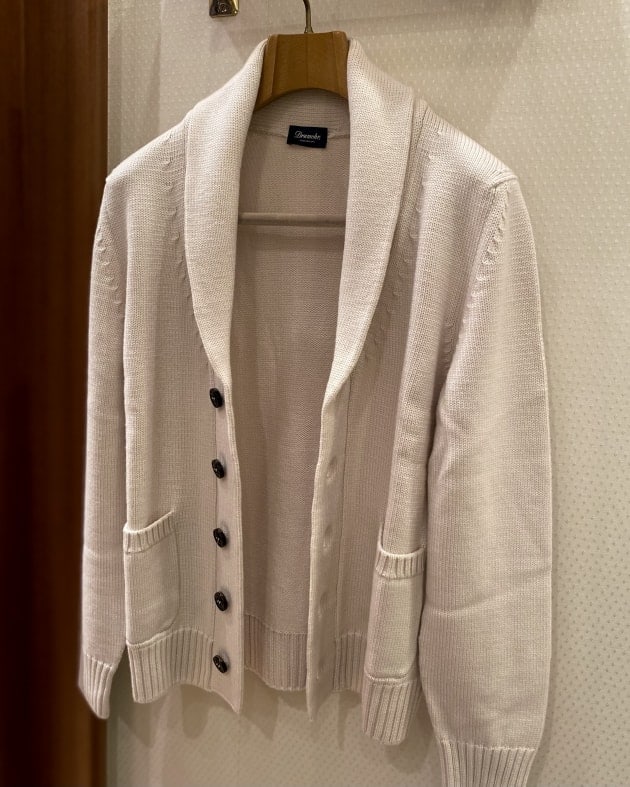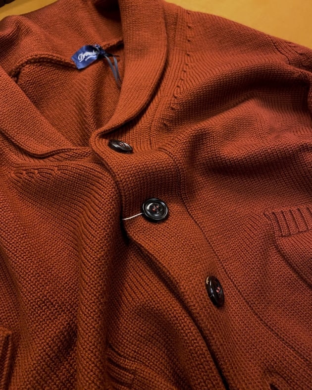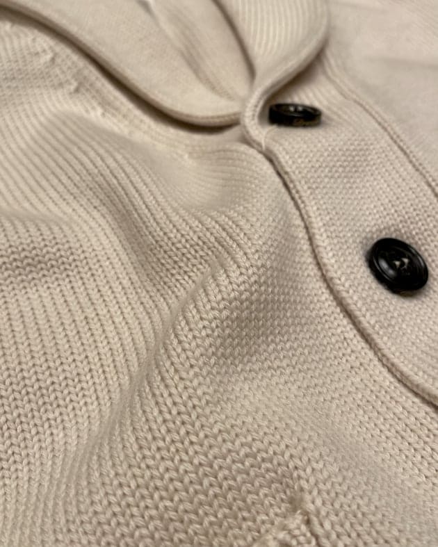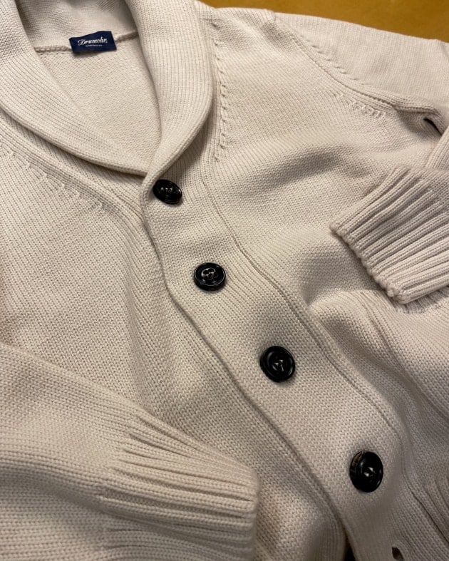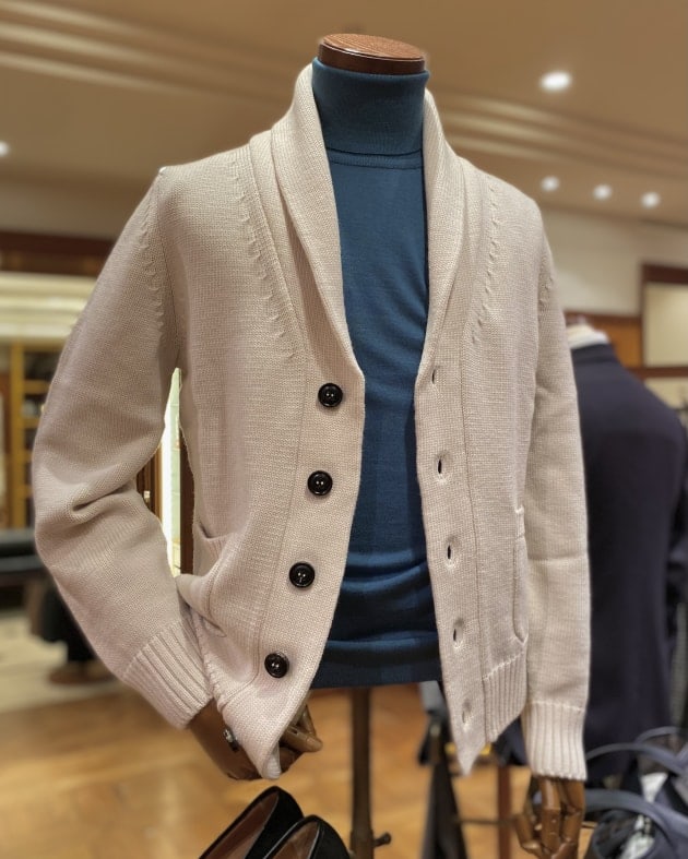 Vや襟付きなど豊富な種類で多くのブランドから提案されているカーディガンですが、こちらはリラックス感を演出するのに最適なショールカラータイプ。