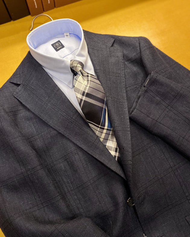 この色柄であれば合わせるネクタイもかなり広がりますね。気をてらうことなくチェックなど柄の強いシャツやネクタイを是非。