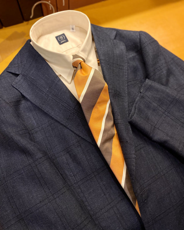 生地の軽快感を活かして、同様にコットンやリネンがブレンドされた軽いシャツやネクタイで春夏らしい涼し気なVゾーンもおすすめです。
