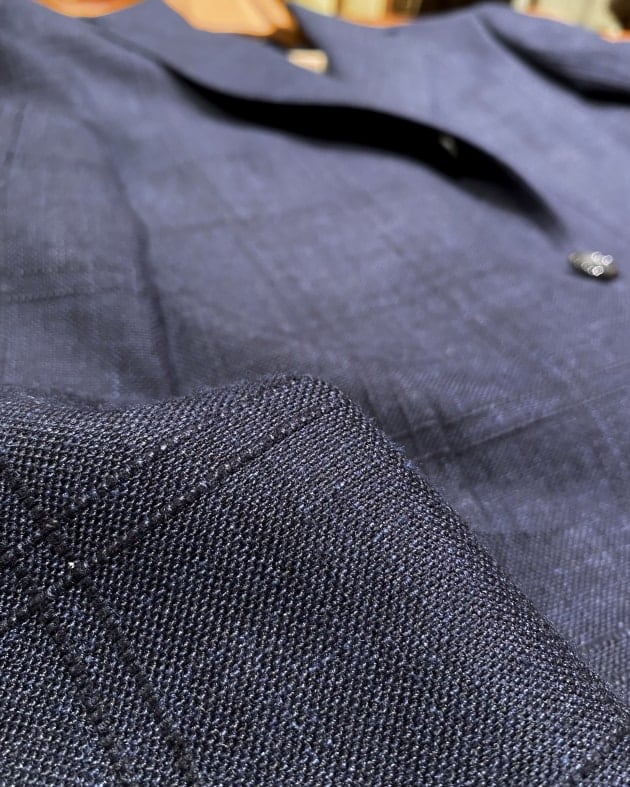 ブルー系も混ざったメランジのネイビーベースに、同じくネイビーのウィンドウペーンが織りによって立体的に表現されています。