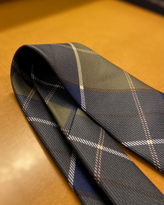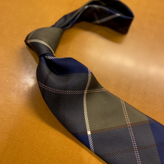 モスグリーンのような落ち着いたグリーンをベースに、ネイビー、ブラウン、ホワイトで構成されたチェックタイ。