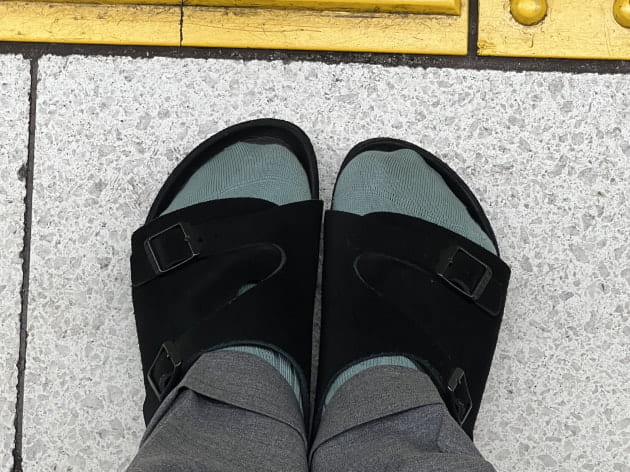 店頭にある商品を合わせてコーディネートを組みました。私のオフの日はリアルにこんな感じです。サンダルの中でも単色でスポーティ過ぎないのでスラックスとの相性も良いです。お好みでカラーソックスを、という感じですね。