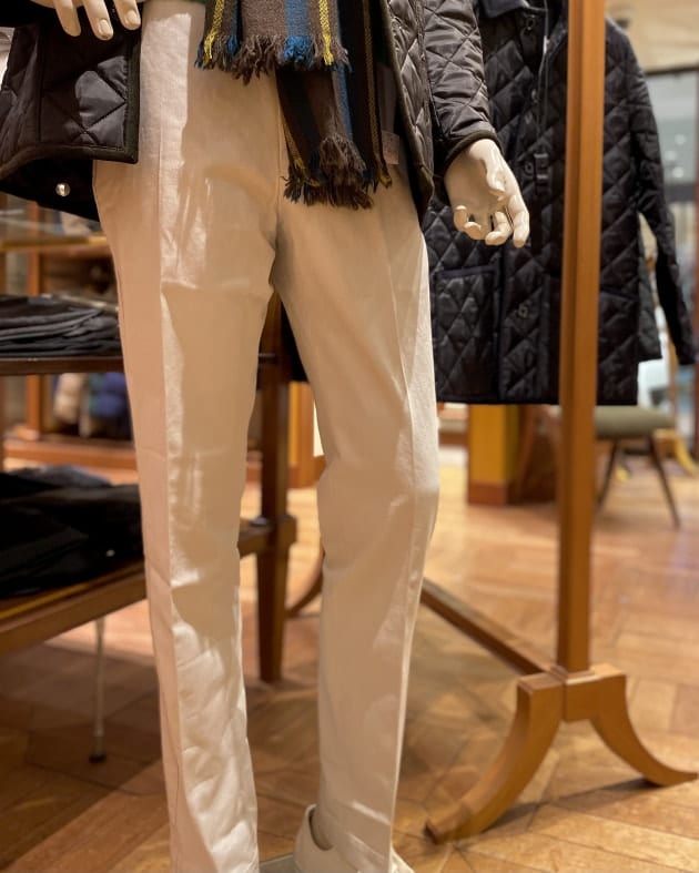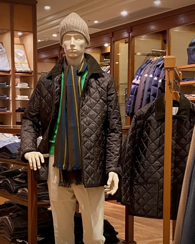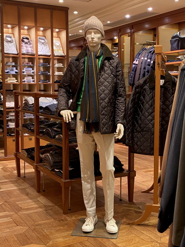 〈MACKINTOSH〉のキルティングアウターを使った、マネキンコーディネートのご紹介です。