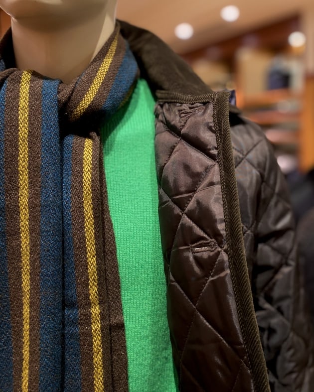 〈MACKINTOSH〉の定番キルティングアウター『WAVERLY』を使用した、大人の休日スタイル。強い発色のニットを取り入れつつ、嫌味なくナチュラルに、上品で落ち着いた印象に仕上げています。