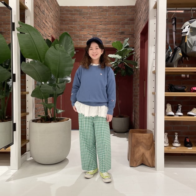太めなパンツ幅と短めな丈感のカジュアルさに、可愛い色のギンガムチェックが私の心に刺さります。。!