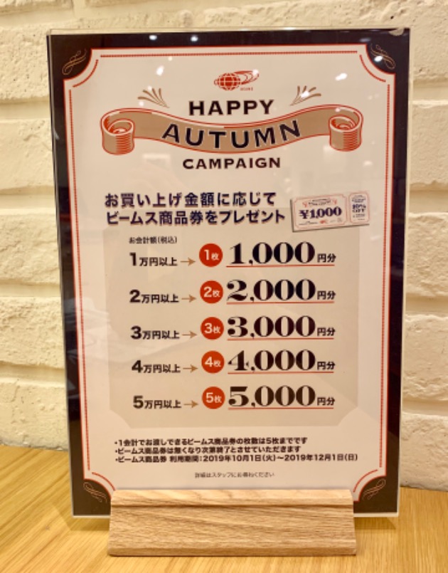 2019年8月31日(土)~9月30日(月)の期間中にビームス各店および公式オンラインショップにて10,000円(税込)以上お買い上げの方に、 2019年10月以降にご利用いただけるビームス商品券をプレゼントします。