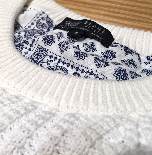 表地に大き目のワッフル編みが施されたクルーネックニットです。素材はコットンを使用しており、サラッとした着心地です。裏地、タグ周りにペイズリー柄の生地を充てており、見えづらい箇所にもこだわりが伺えるアイテムとなっております。